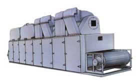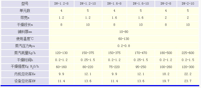 DW帶式干燥機是穿流連續式干燥設備,用于透氣性較好的片狀、條狀、顆粒狀物料的干燥,對于脫水蔬菜、中藥飲片等類含水率高、而物料溫度不允許高的物料尤為合適;該系列干燥機具有干燥速度快、蒸發強度高、產品質量好的優點,對脫水濾餅類的膏狀物料,需經造粒或制成條狀后亦可干燥。