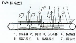 物料由自動配料器均勻地鋪在焊接網帶上,網帶一般采用12-60目不銹鋼絲網,由傳動裝置拖動在干燥機內移動。干燥機由若干單元組成,每一單元熱風獨立循環,部分尾氣由專門排濕風機排出,廢氣由調節閥控制,熱氣由下往上或由上往下穿過鋪滿物料的網帶完成熱量與質量傳遞的進程,帶走物料水份。網帶緩慢移動,運行速度可根據物料溫度自由調節,干燥后的成品連續落入收料器中。上下循環單元根據用戶需要可靈活配備,單元數量亦可根據需要選取。
